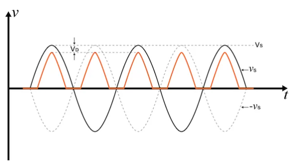 在確定在整流電路中使用哪些二極管時(shí),需要考慮兩件事:1) 二極管處理電流的能力,必須根據(jù)二極管預(yù)期傳導(dǎo)的最大電流進(jìn)行選擇,以及 2 ) 峰值反向電壓 (PIV),即二極管將承受的最高反向電壓;二極管必須能夠承受 PIV??磮D1.2(A),我們可以觀察到,當(dāng)電壓 v S 為負(fù)時(shí),二極管將被截止,電壓 v O為零,導(dǎo)致二極管兩端的反向電壓為v S . 因此,PIV 是v S的峰值: