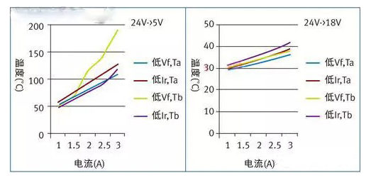 以兩個直流/直流轉(zhuǎn)換器為例,兩個都是24V輸入電壓,但其中一個是18V輸出電壓而另一個是5V。使用Vin和Vout的比值計算得到占空比,并且使用數(shù)據(jù)表中的Vf和Ir值計算出二極管內(nèi)總功率的損失。然后根據(jù)總功耗計算出由此導致的二極管溫度,并查找在此溫度下的Vf和Ir實際數(shù)值。最后根據(jù)新的二極管溫度重新算出內(nèi)部功耗。這個迭代過程可以重復多次以提高精確度,但如果只想大致表明Vf和Ir的不同取舍所產(chǎn)生的影響,單次迭代就足夠了。