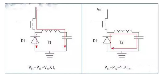 當時間為T2時,輸出電流(Iout)流經(jīng)D1。所產(chǎn)生的損耗與D1的正向電壓(Vfw)和輸出電流直接相關(guān)。PT2等于Iout*Vfw。顯然,我們希望盡可能降低以控制損耗,減少發(fā)熱。